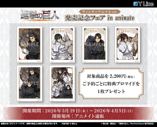 「TVアニメ『進撃の巨人』ウィンターアニマルver.発売記念フェアin animate」がアニメイト通販にて開催! 描き下ろし絵柄の特典ブロマイドがもらえる!!