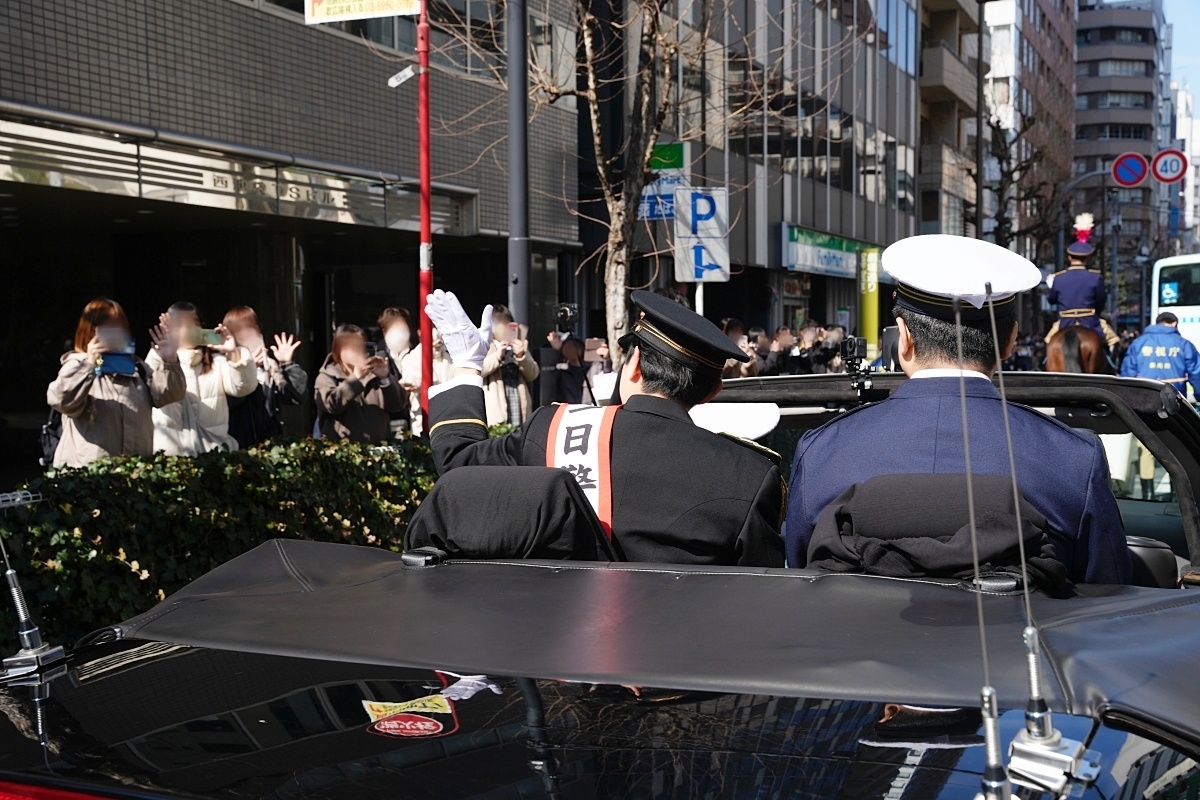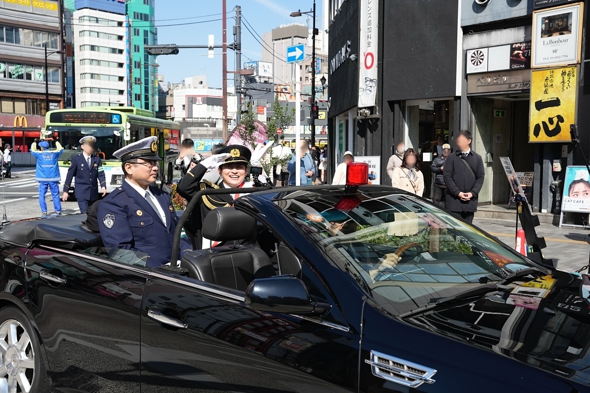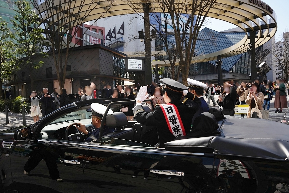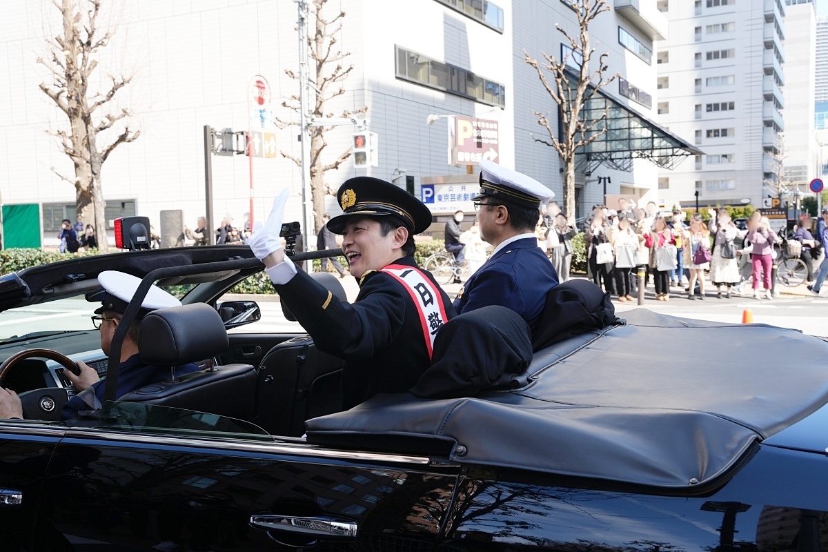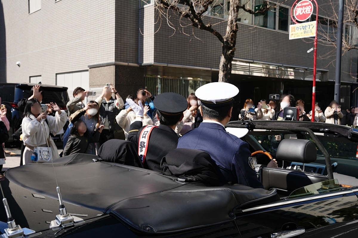 警視庁音楽隊やカラーガード、騎馬などに率いられ、オープンカーに乗る下野さん。照れつつも嬉しそうな表情でファンの声援に応えていました。