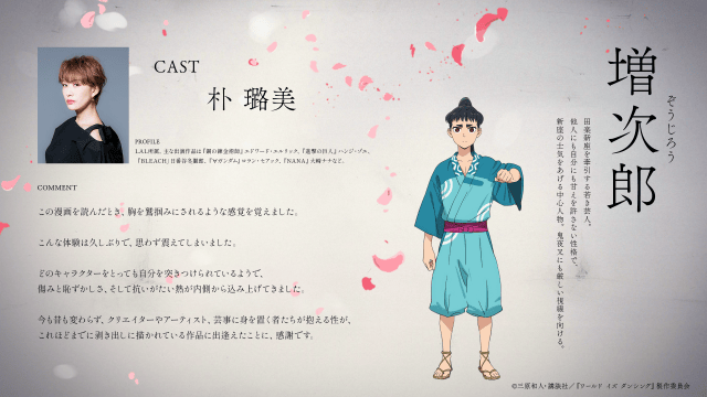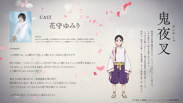 「舞っても舞わなくても人は死ぬのだ」花守ゆみり演じる鬼夜叉(後の世阿弥)の衝撃的なセリフから始まるティザーPVでは、新たなキャラクター・キャストが続々と解禁になりました。世阿弥の父であり世阿弥と同じく能を大成させた人物として知られている観阿弥役を小西克幸が演じます。さらに土屋神葉、内田真礼、朴璐美、石谷春貴の出演がティザーPVで解禁となりました。