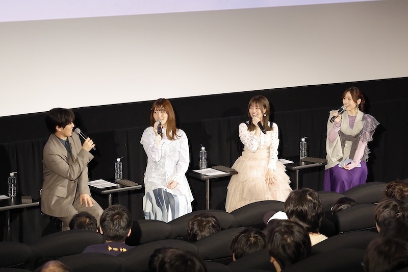第1話の上映後、MCの呼び込みで石谷春貴さん、石見舞菜香さん、鈴代紗弓さん、長谷川育美さんが登場。春らしい装いで現れたキャスト陣に、客席から温かい拍手と歓声が送られます。