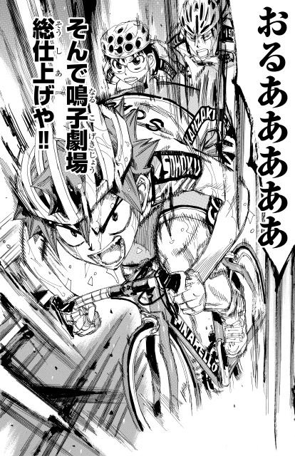 「意地?…….そんなもん張ってナンボやろ!!」鳴子章吉の魂が見えて本当に素敵です。何度も読んで何度も涙を流しました。酸欠で目が見えなくなって、小野田くんがいる方向も分からない。自分を犠牲にしてまでチームを勝たせる。カッコイイ以外の何物でもありません。