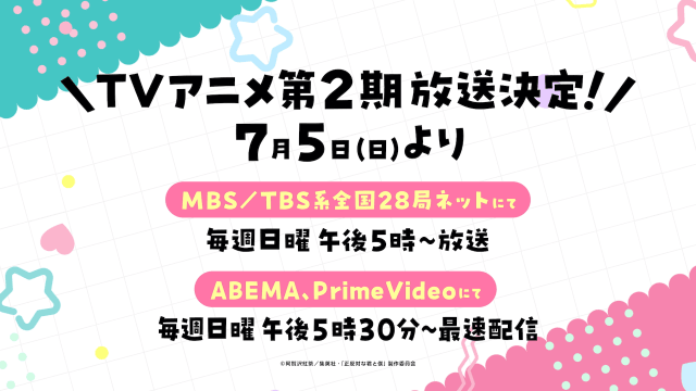 あわせて、放送情報も解禁。TVアニメ第2期は7月5日(日)よりMBS/TBS系全国28局ネットにて毎週日曜午後5時〜放送開始。ABEMA、Prime Videoにて毎週日曜午後5時30分〜最速配信されることも解禁に。