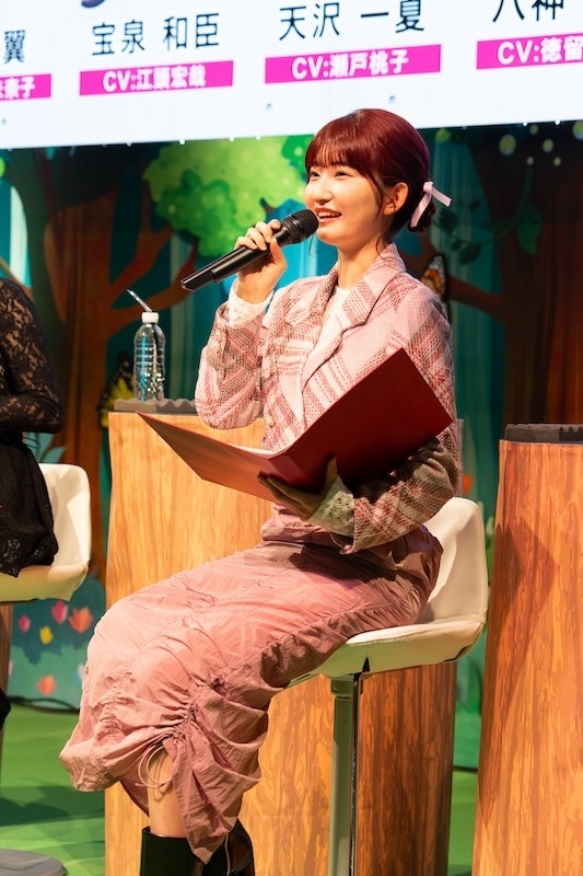 千葉さんから、天沢以外の気になる新キャラクターを聞かれ、瀬戸さんが新1年生の中で最初に名前を挙げたのは、椿桜子。「自分の名前が『桃子』なので、オーディションの時、椿にめちゃくちゃ力を入れていたんです」という裏話を明かして、千葉さんやファンを笑わせました。久保さんは「この作品では優しそうなイケメンがそのままでは終わらないので、八神(拓也)君は、どうなんだろう」と気になっていると語ります。