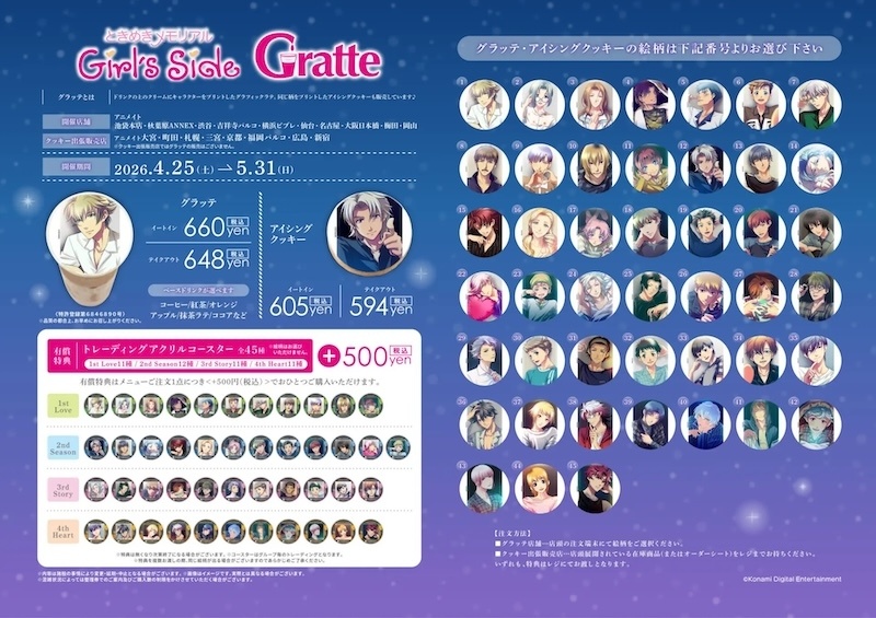 期間中『ときめきメモリアル Girl’s Side』関連のグッズ・グラッテ飲食・有償特典をご購入・ご予約内金1,100円(税込)毎にブロマイド(全4種)を1枚プレゼント!