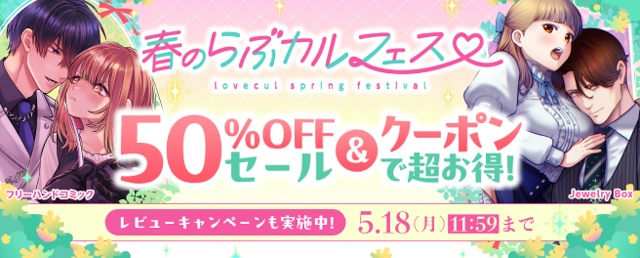 「らぶカル」では4月16日(木)から5月18日(月)まで、TL/乙女向け作品がお得に購入できる「春のらぶカルフェス2026」を開催中です! 期間中は対象作品が50%OFFになるセールや、各種クーポンを配布! この機会にぜひ、覗いてみてください♡