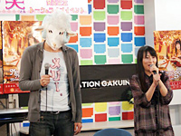そんな中、そのメリーくん本人が会場に登場。舞台脇から現れたメリーくんは……なんかでかい。この日、友達の羊の結婚式で欠席したメリーさんは身長150センチそこそこなのに対して、メリーくんは、188センチあるという。いったい彼って何者? 実は、このメリーくん、タイトル曲「メリー!メリーゴーランド」の作曲・編曲を担当した菊田大介さん(Elements Garden)だったのだ。