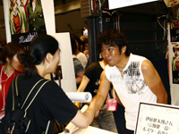 15日は、伊藤健太郎さんがブースに登場。熱気が立ちこめる会場で、汗びっしょりになりながら、ファンひとり一人、丁寧にポスターを渡して、握手をした。