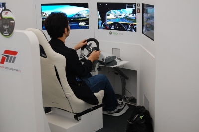 マイクロソフト製品では、やはり『HALO』シリーズ最新作『Halo 3: ODST』が人気。また、TGSならではの試遊体験ということでは、ドライビングシート+ステアリングコントローラー+3面スクリーンで実車さながらのプレイ感が楽しめる『Forza Motorsport 3』が目立っていた。この3面鏡のように配置された3面スクリーンによる画面表示には、Xbox 360が3台必要らしく、家庭で再現するのはなかなかハードルが高いので、一度体験してみると面白い。
