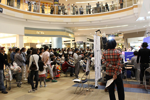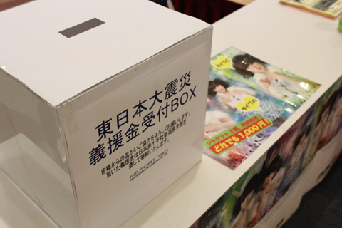 会場に戻るとビックリするほどの人が集まっていました。物販コーナーでは義援金BOXも設置。被災地への気持ちを忘れないまいにゃ。