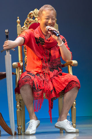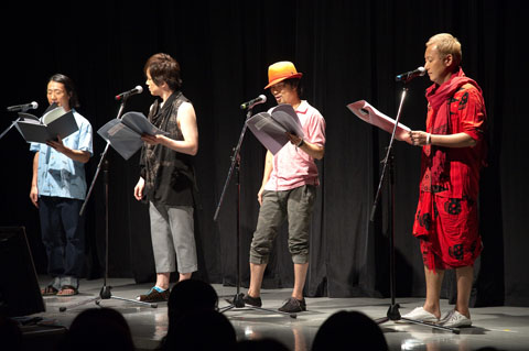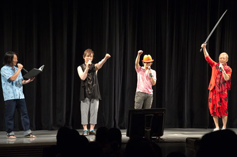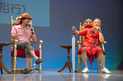イベントは『白雪姫』の王子様役の中井和哉さんのナレーションからスタート。そのナレーションにあわせ竹本さん、そして少し遅れて置鮎さん吉野さんが登場すると、まずはスーパークールビズ姿の竹本さんへ「現地のガイドさんですよね?」と突っ込みを入れ会場を笑わせ、ステージに用意された花道を3人がファッションショー風に使いポーズを決めると大きな歓声が沸き起こった。さらに遅れて登場した小野坂さんの手にはなぜか剣が握られ、イベント中ことあるごとに剣を振り回し、それにあわせ斬られるSEが鳴ったり鳴らなかったり、そしてそれにあわせ斬られる他の出演者たちで会場は大きく賑わった。