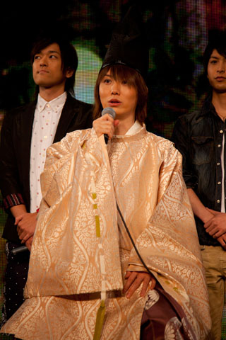 頑張りたいと思います。実際に平安時代の格好の衣裳を着てみて、すごく重たいです。こういう格好をさせていただくのは、初めてなのですが、お腹まわりなどはしめつけが凄いですね。」