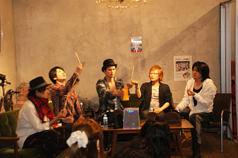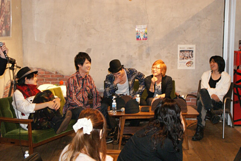当日は、カフェでのトークライブとあって、女性ファンたちは、のっびりとケーキと紅茶をいただきながらの参加。会場には、キャストの大河元気さん(弘徽殿女御役)、Kimeruさん(明石の姫君役) 、平田裕一郎さん(朧月夜役)、広瀬友祐さん(藤原氏役)、川隅美慎さん(末摘花役)が登場し、稽古の様子などを語ってくれた。