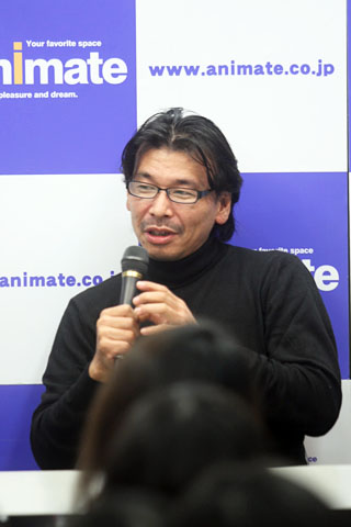 入場するなり「一人ですよ!どうしよう」と緊張した様子の下野さん。また客席との近さにも戸惑い気味。まずは下野さんと、ドラマ部分の脚本、楽曲の作詞などを手がけたトータルプロデューサーの日山尚さん、音響監督の赤間明吉さんのトークコーナー。下野さんがイリヤ役に選ばれた理由について「イリヤはヘタレキャラ。最初に思い浮かんだ」と赤間さんに言われて苦笑いの下野さんだったが、「イリヤのイメージにピッタリでした」と日山さんに言われて嬉しそう。そんな下野さんのイリヤを演じた印象は「久しぶりの暗いキャラで楽しみながら演じさせてもらいました(笑)。自分に似ているところもあるキャラです」。
