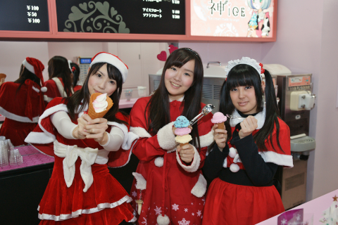 さて、まず通りに面した1階の店舗はというと「神アイス」。こちらはその名の通り、アイドルの卵たちが店員のアイスクリームショップ。店員さんは「このあと3階でライブがあります」というガチアイドルもいれば、専業の店員さんもいるみたい。扱っている商品はもちろんアイスクリーム!……とホット&アイスのドリンク類。オススメを聞くと「神バニラと神アイスクリームになります!」とのこと。一番高い「神ソフトクリーム」(550円)を注文してみたところ、うーん、濃厚! 牧場で出てきそうな乳脂肪分多めなタイプ。ごはん処が増えたアキバだけど、この界隈はおいしいスイーツの店は少ないので、これは要チェックですぞ。ドリンクではこのシーズンは、真心こもった神カプチーノ(400円)がおすすめとのこと。なんとこのお値段で、シナモンパウダーでラテアートまで描いてくれた。ひょっとしたら今描いてくれているのは未来のアキバ系人気アイドルかも!? なんて思ったら、一際おいしく感じられたぞ。