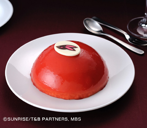 ケーキは、透明感のある赤色をストロベリーとラズベリーのグラサージュで表現し、白いレアチーズムースをコーティングしたもので、上にのせたホワイトチョコによりバニーマークを再現。ケーキの中にはバーナビーの好きなロゼワインにラズベリーを混ぜたソースが入っており、味にアクセントとバーナビーらしさが加わっている。