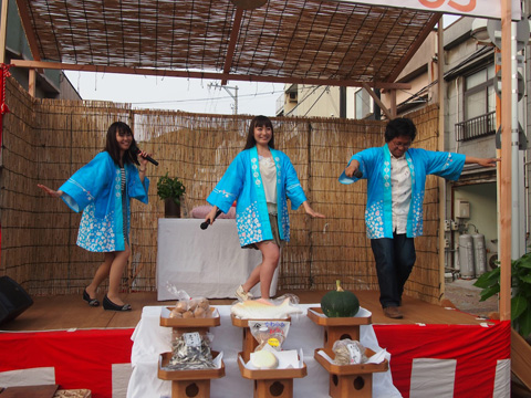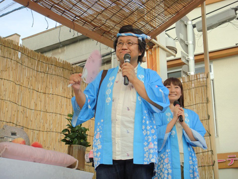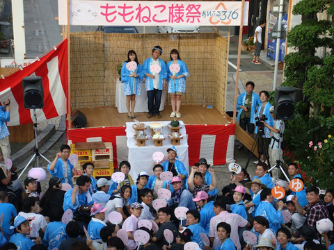 いよいよ「ももねこ様祭」のメインイベント「ももねこ音頭」がスタート。たまゆらファンと竹原市の皆さんも参加、音頭の途中には竹原市の小坂市長も挨拶をする等、会場は大いに盛り上がった。