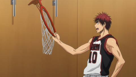 レギュラー陣の軽い調整と豪語し、エース黄瀬を温存する海常に対して誠凛の怒りが爆発、火神がダンクシュートによりゴールを破壊する。