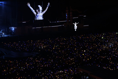 熱気が加速するライブ中盤戦、『Synchrogazer』ではなんとステージ(バックスクリーン側)から空中遊泳による登場。その高さはなんと地上30mの高さでアリーナ後ろ(ホームベース側)まで約120mと水樹さんのライブでは史上最長距離。そのまま、全長12mの巨大船「ユニオンスター号」に乗船しながら会場を周るという大胆かつ驚愕な演出で、客席からは大歓声が溢れていた。