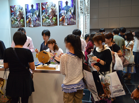 ジェネオンブースで、22日(土)14時から行われた『薄桜鬼』の抽選会に女性ファンがあつまり、かなりの混雑が発生。整理券を事前配布してもの混雑のため、さすが新撰組のご当地の京都! ファンの注目度の高さが分かる。