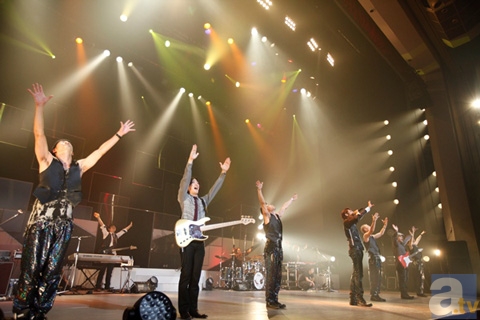 メンバー紹介に続いては、雰囲気をガラリとかえた白い衣装で登場し、バラード曲『Beautiful Life』を歌いあげた。そしてここからはアコースティックコーナーへ突入。2010年のライブツアー「WONDERING!」以来となる『逆さま地球 -acoustic-』やブルースハープを吹く姿を披露した『A Happy New Year to you』(元曲は『Xmas to you』)に加え、4月10日にリリースが決定しているニューシングル『カノン』のカップリング曲『FOREVER LULLABY』を次々に歌いあげ、その甘い声で会場のファンを魅了した。