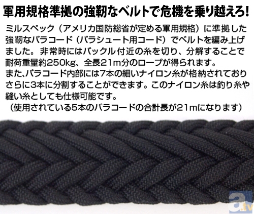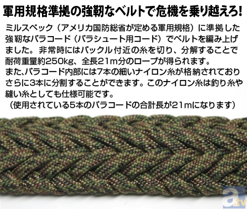 サバイバルベルトとは、ミルスペック(アメリカ国防総省が定める軍用規格)に準拠した強靭なパラコード(パラシュート用コード)で編み上げられたベルトのこと。非常時にはベルト本体を破壊することで、耐荷重量約250kg、全長21m分のロープが得られるという、サバイバル仕様のアイテムとなっている。さらに、ベルトにはジオン、地球連邦軍の2種類のバージョンがあるぞ。有事に備え、コレを装備して万全の準備をしておこう! 君は生き延びることができるか?