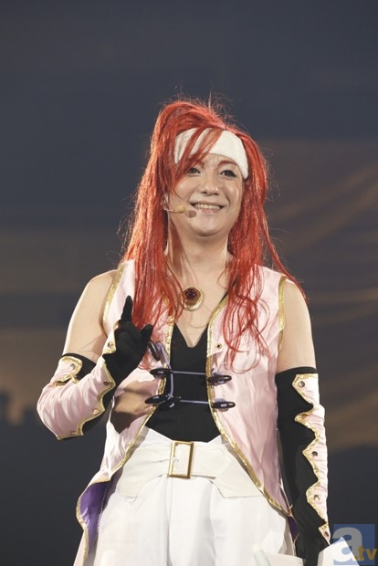 ファンのエールをじっくり受け取るかのようにステージを少しずつ回りながら、パワフルな歌声を披露!! 歌い上げた6曲はいずれも『テイルズ オブ』シリーズの楽曲で、スクリーンには各タイトルの映像も映しだされ、思い出がシンクロするかのように、会場は終始ファンが振るサイリウムの輝きと熱い熱気に包まれていた。