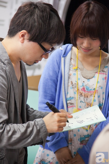 新海:またそのうちの高校生の女の子は、スタッフ経由でお手紙をいただいたことがあるんです。手紙に彼女のtwitterアカウントが書いてあったので見てみたら、「新海さんのサイン会にどうしても行きたいんだけど、体育祭のため行けなくて悲しい」と書かれていたんです。そして、今日の観覧募集に当たったことも書かれていたので、これはサインをしてあげなきゃと思いました。