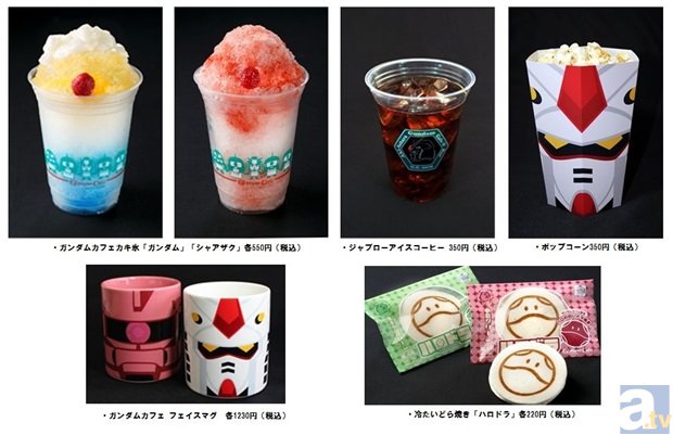 ガンダム、シャアザクをモチーフにした冷たいデザート「ガンダムカフェカキ氷」、「ハロドラ」や「ジャブローアイスコーヒー」など、暑い夏にピッタリのメニューを取りそろえてお待ちしています。