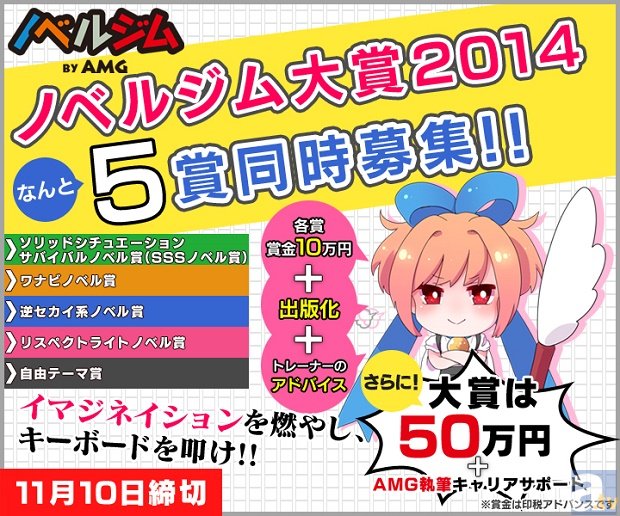 ノベルス学科等8学科を擁する専門の学校・アミューズメントメディア総合学院(以下AMG)は、AMGが運営する小説創作サイト『ノベルジム』において、 「ノベルジム大賞2014」コンテストを開始。 「ソリッドシチュエーションサバイバルノベル賞」「ワナビノベル賞」「逆セカイ系ノベル賞」「リスペクトライトノベル賞」といったノベルジム独自の4テーマに、「自由テーマ賞」を加えた5つの賞の同時募集が行われる。