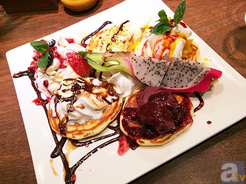 カラミアが作るパンケーキをアクセル(とキリエ)が監修し、豪華にアレンジしました。アクセルの要望でボリューミーに、キリエの要望で贅沢に。『ベリー』『マスカルポーネ』『フルーツ(マンゴー・キウイなど)』『バナナ』『アサイー』の5種類がひとつのプレートで楽しめます。