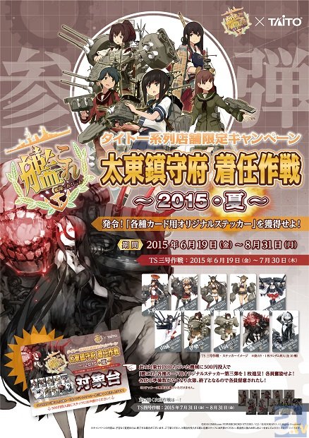 株式会社タイトーは、艦隊育成シミュレーションゲーム『艦隊これくしょん-艦これ-』(以下、艦これ)のオリジナルノベルティがもらえるキャンペーンをはじめとする【太東鎮守府着任作戦2015-夏-】を6月19日(金)から、全国のタイトー系列店舗約100店舗で実施します。