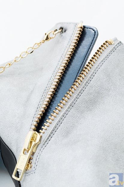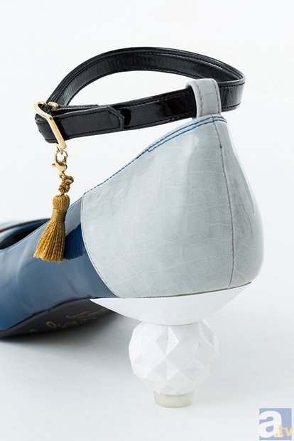 三日月宗近の着物のような美しいブルーに袴をイメージした淡いグレーの差し色が入った本体。アッパーのベルトとストラップは三日月の髪飾りをイメージしたデザインになっております。ストラップのフリンジは取り外してもお履きいただけます!