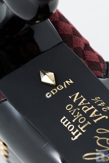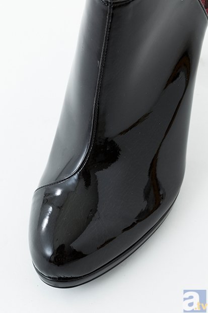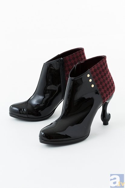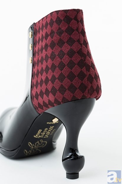 加州清光をイメージしたデザインのブーティです。本体の後部に使用している生地は加州のロングコートの裏地をイメージしたダイヤ柄。この靴のためだけにレーザー加工で柄を表現しています。金ボタンも加州のロングコートから落とし込んだデザイン!ブラックの本体にゴールドが映えています。