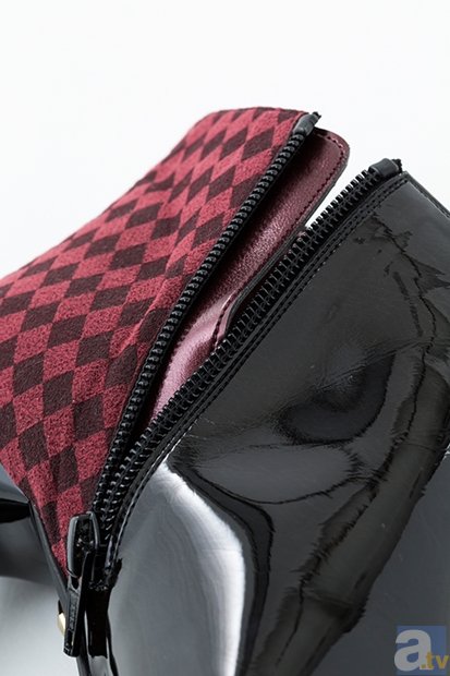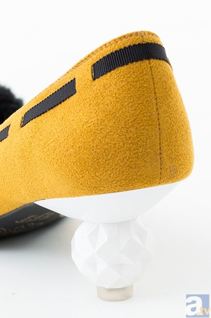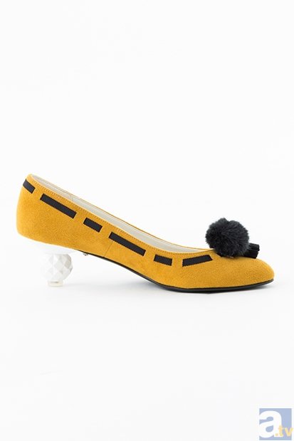 小狐丸の着物の装飾にあるようなブラックのポンポンやフリンジがアッパーに付いたデザイン。内側のデザインは小狐丸の髪色をイメージしたホワイト。本底には小狐丸の瞳をイメージしたビジューが!普段は見えないようなところにもこだわっているデザインが嬉しい!本体にぐるりと装飾されたブラックのリボンが上品な印象を与えてくれます。