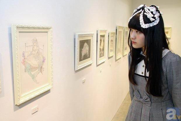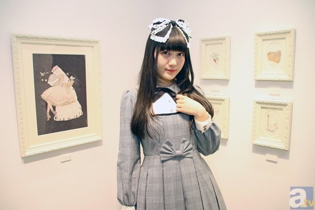 個展会場に到着するやいなや、驚いたのは大塚さんの姿。まるで今井さんのイラストから飛び出してきたかのような可愛らしいロリータファッションに身を包んでおり、筆者&スタッフ共々、ほっこりした空気に包まれます。「よろしくお願いします!」と元気よく挨拶する様子は流石アイドルといった感じです。