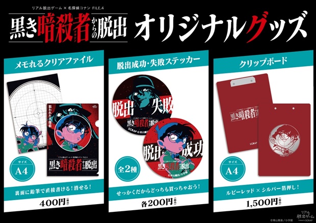 また『名探偵コナン』とコラボレーションし、同じく"黒ずくめの組織"がストーリーのカギとなる、リアル脱出ゲーム「黒き暗殺者(アサシン)からの脱出」が、3月18日(金)より全国47都道府県すべてで順次開催決定しました! この史上最大規模のツアーであり、「コナン」とのコラボツアー第4弾となる本公演オリジナルのグッズも初公開。定番のクリップボードや、鉛筆で文字を書いたり消せたりする「メモれるクリアファイル」など、イベント会場でのみ買える人気商品にご期待ください!