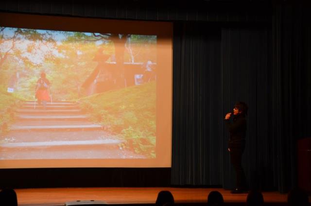 開始早々、登山道の入口のシーンでは、佐藤さんが冷静な口調で「ちょっと1回止めてください」とひと言。何事かと思えば、佐藤さんが「さも、まっすぐここへ行ったように(映像では)なってますけど、1回、この段階で道に迷ってます。実は……」と告白すると、客席からドッと笑いが。そして5キロほど登った所にある中ノ茶屋で小休憩。お団子を食べて、体力を回復する佐藤さんの姿を観客も楽しそうに見つめます。