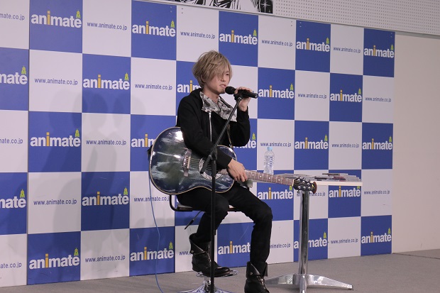 第2部が始まると、早速MIKOTOさんが登場です。司会者とのアニメイトについての軽いトークから始まり、アニメ『DIABOLIK LOVERS』の話に触れるとOP曲『Mr. SADISTIC NIGHT』を弾き語りで突然歌い始めるMIKOTOさん。「自分の曲が初めてテレビで流れるのを聴いた大事な一曲です」と笑顔を見せました。