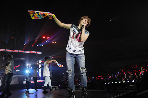 続けて披露された『シャイン』では、トロッコに乗ってアリーナ外周へ。笑顔を見せてくれる「Feel me」、お腹をチラ見せしてくれる「Touch me」、全力のキス音を聞かせてくれる「Kiss me」で繰り出される破壊力に、会場からはこの日一番の歓声があがっていた。