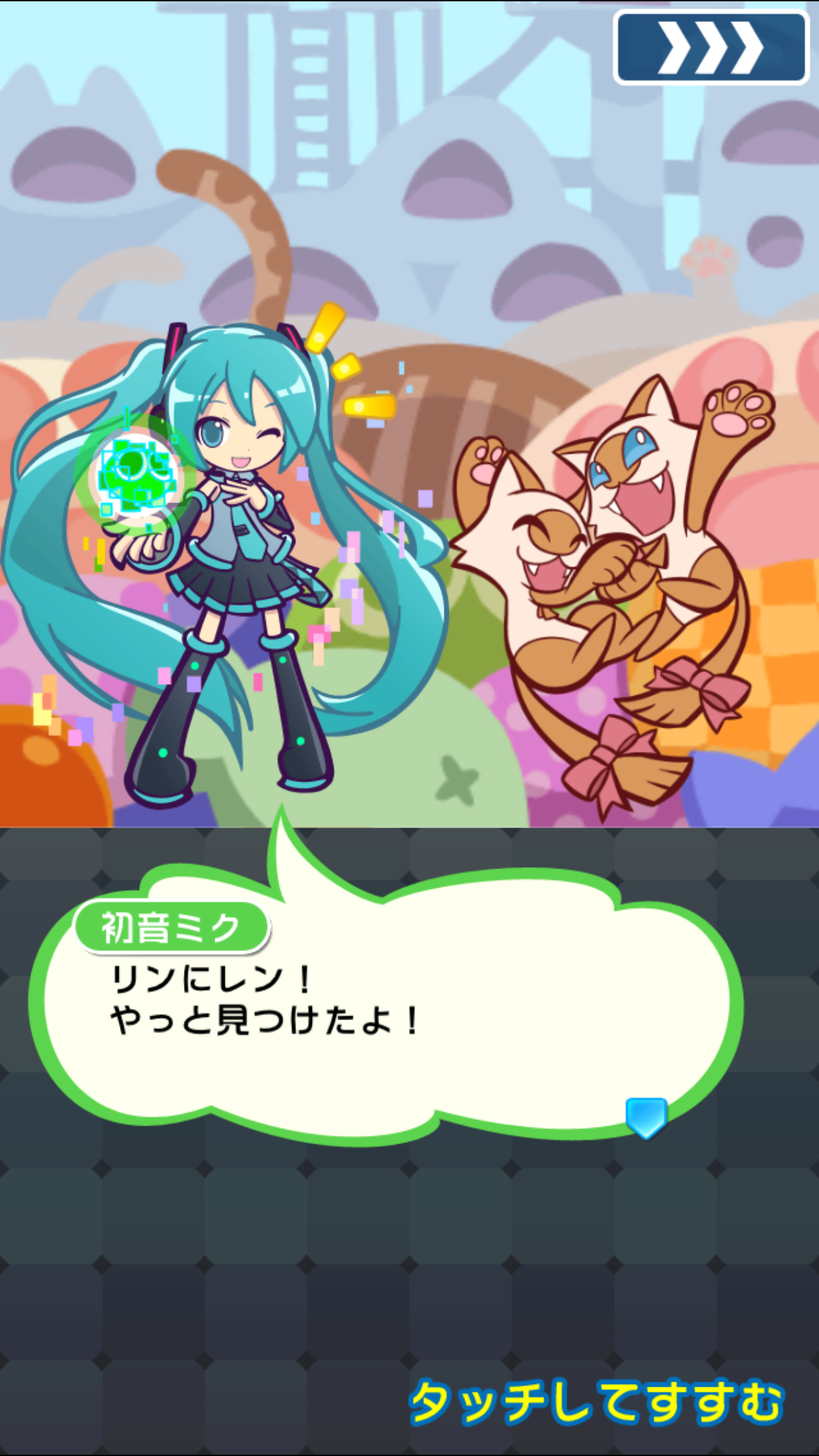 ミクの願いは、盛大なライブを行い、みんなに歌声を届けること。アルルの助けを借りて、散り散りになってしまった他の仲間たちを集めるべく歩き回ります。