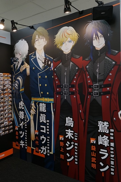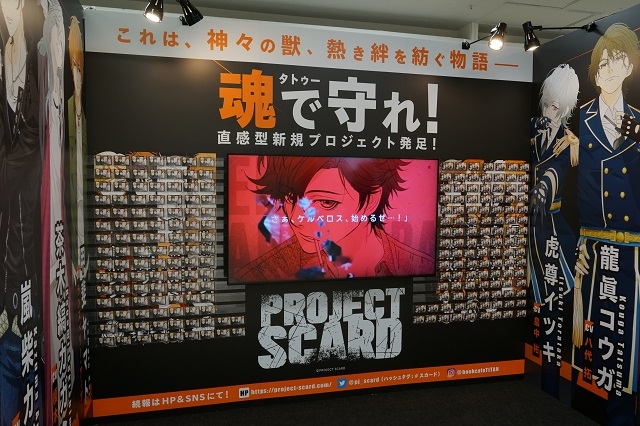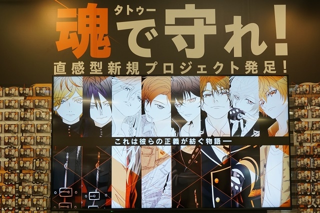 「魂(タトゥー)で守れ!」のキャッチフレーズが目を引く、YELLOW AREA:Y-35「フロンティアワークス新規プロジェクト」のブースへ。中央にはモニターが置かれ、左右には等身大のキャラクターが4人ずつ、訪れたファンを出迎えます。