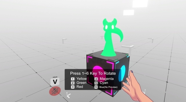 白い空間が広がっており、キューブ型の端末を操作して、サークル参加されている方々のブースを展開していきます。キューブに表示されるぴょこぴょこと動くキャラクターや、歩いて見つけるのではなく、端末から呼ぶという仕組みも面白かったです。