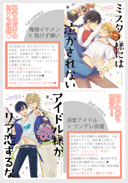 『ミスター様には泣かされない』『アイドル様がリア恋するな』コミックス好評発売中!