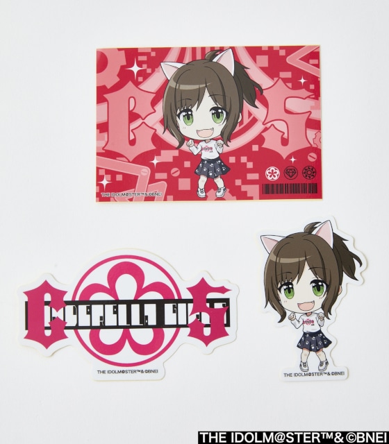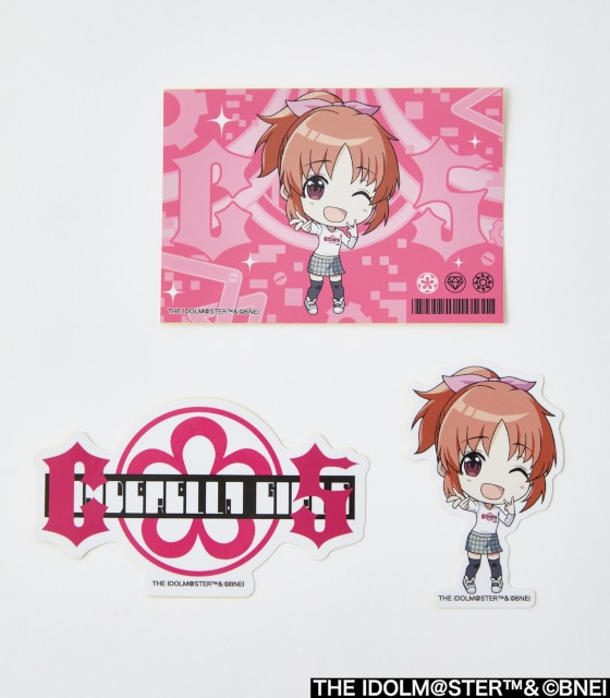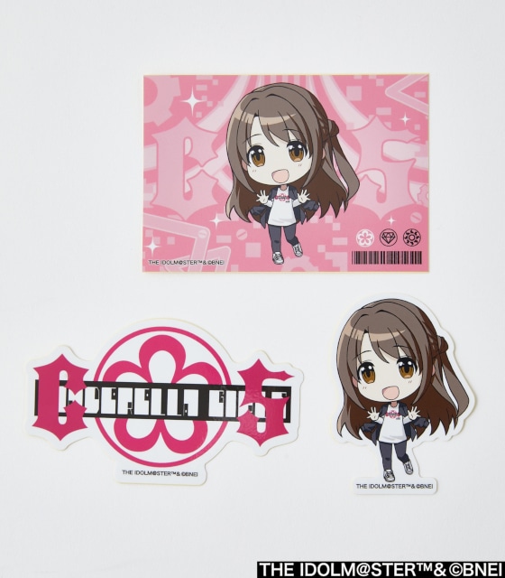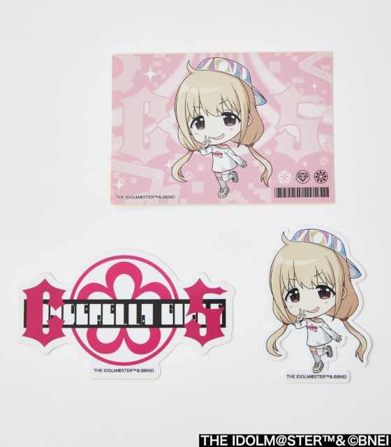 1枚で存在感がある背景付きのSD描き起こしステッカー、そのアイドルの姿がダイカットされたステッカー、ロンTのデザインを用いたステッカーの計3枚セット。お好きな絵柄を自由に貼ってお楽しみください!