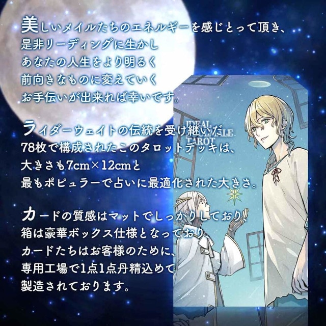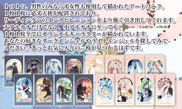 カード78枚すべてにイケメンキャラクターが描かれ、占い初心者にも使いやすい「アイデアルソウルメイルタロット」と、アニメテイストの美しい世界観のイラストが楽しめる「ルナズライトエンジェルタロット」、「ルナズダークエンジェルタロット」が6月に発売されましたので、ぜひチェックしてみてください♪