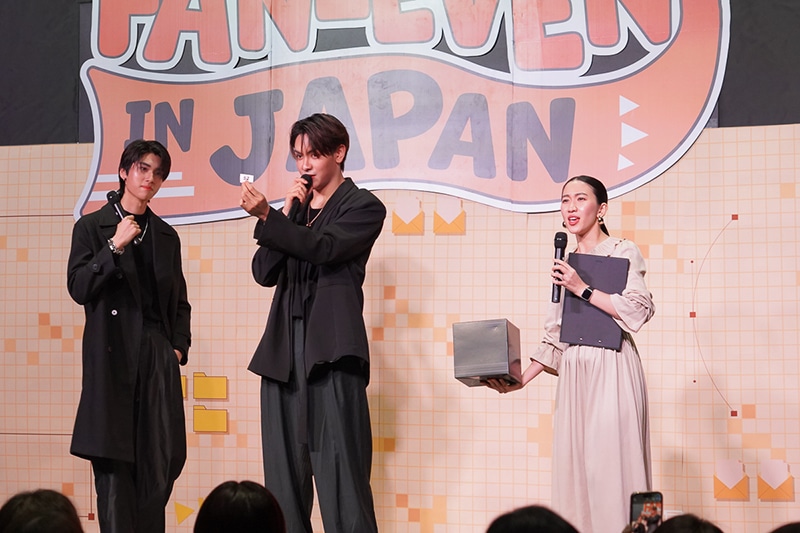 ふたりは日本語で「皆さんこんにちは。JOONGです」「私はDUNKちゃんです、OK?」と挨拶。東京でふたりでのファンイベントを開催するのは初めてとのことで嬉しそう。前回の「GMMTV FAN FEST 20223LIVE IN JAPAN/GMMTVフェス」について、「会場が大きくあまり顔が見れなかったんですが、今回は丁度いいサイズの会場ですので、皆さんの表情が見られて嬉しいです。温かい雰囲気で、家族のような気持ちです」とJOONGさん。DUNKさんは「ファミリーデーのような形で、皆さんをより身近に感じられるようなイベントになるんじゃないかなと思っています」とコメント。