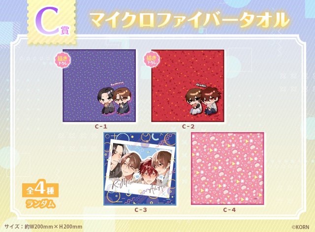 B2タペストリー、アクリルビジュアルボード、マイクロファイバータオル、ミニアクリルスタンド、缶バッジといった豪華景品から、ハズレなしで必ずいずれかが当たります。中には、KORN先生描き下ろしイラストを使用したアイテムも!!