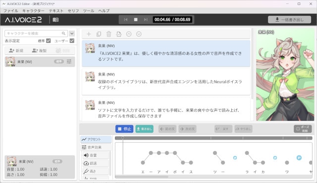 しゃべらせたい文章を入力するだけで、キャラクターの自然な音声で合成・再生でき、音声ファイルとして保存可能。