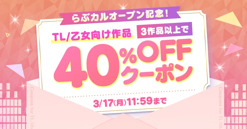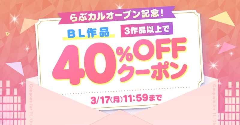 「らぶカル」内のTL/乙女向け・BL作品3作品以上ご購入時に使える【40%OFF】クーポンです。
