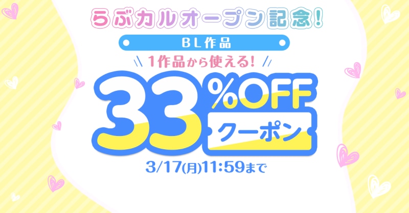「らぶカル」内のTL/乙女向け・BL作品ご購入時に使える【33%OFF】クーポンです。